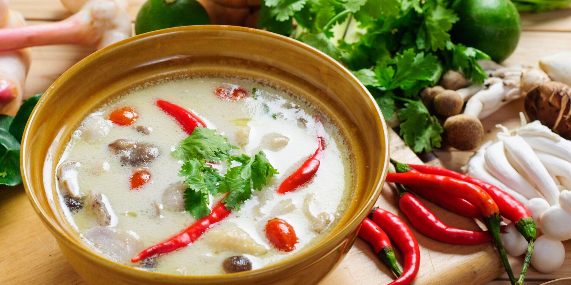 Serveertip: Volgens traditioneel Thais gebruik kun je het citroengras, de galangawortel, de korianderwortel en de kaffir-limoenblaadjes in de soep laten. Echter zijn deze niet eetbaar, dus laat je gasten dit wel even weten!
